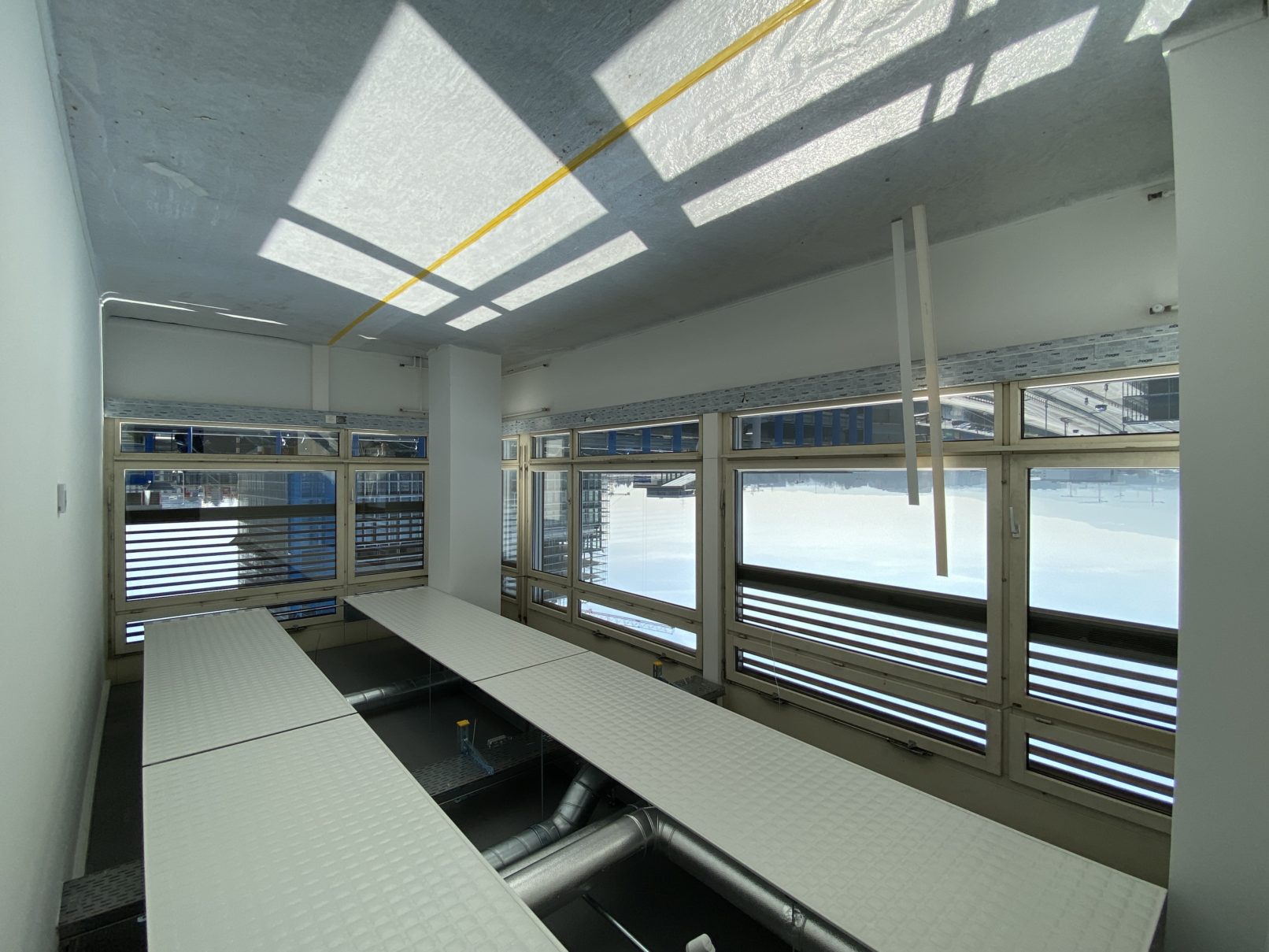 En parallèle à ces travaux de transformation, des dispositions d’économie énergétique et d’assainissement de l’air ont été mises en place pour améliorer les conditions d’exploitation des 3 derniers étages du bâtiment, par la disposition d’un monobloc en toiture et d’une distribution double-flux. Un système de chauffage par panneaux de plafond rayonnant a par ailleurs été mis en place dans tous les locaux associés aux bouches de ventilation.